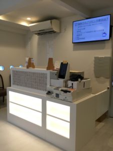 受付カウンターは清潔感のある白で、正面のアクセントタイルがよしこ先生のこだわりポイントです❤