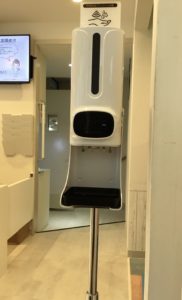 手をかざすと、アルコール消毒と検温が同時にできる機械を入口に設置しました!