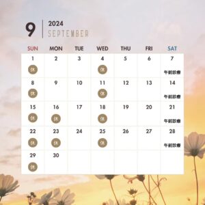 9月1日、4日、8日、11日、15日、16日、18日、22日、23日、25日、29日は休診日です。