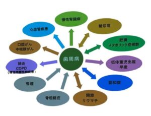 歯周病による炎症によって出てくる毒性物質が歯茎の血管から全身に入り、様々な病気を引き起こしたり悪化させる原因となります。