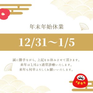 こんにちはyoshiko歯科クリニックです12月31日〜1月5日まで年末年始休暇をいただいております。ご不便をお掛け致しますがよろしくお願いいたします30日までは通常通り診療しておりますので、何かございましたらお電話下さい