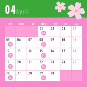 4月1日、5日、8日、12日、15日、19日、22日、26日、29日は休診日です。