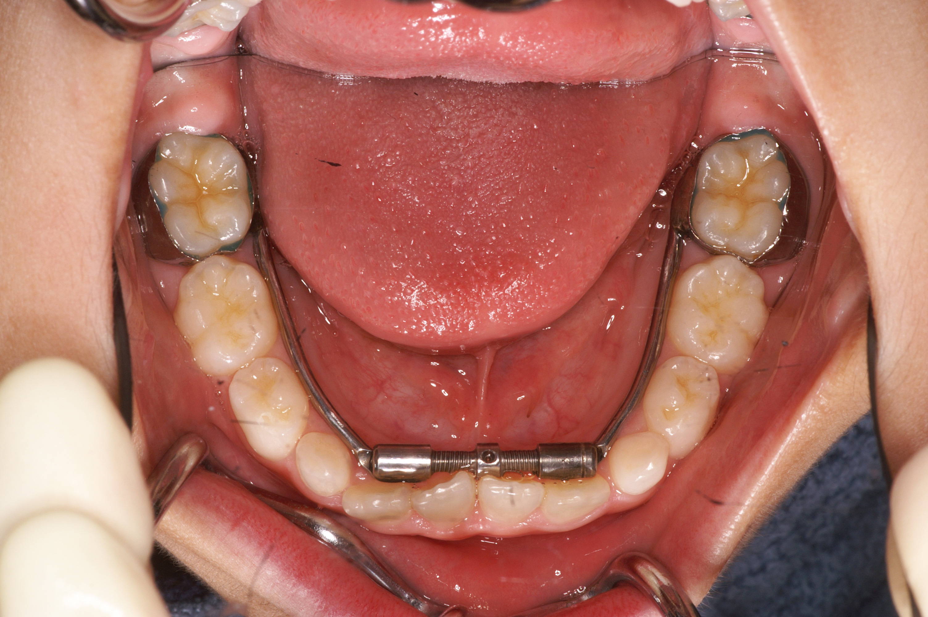 当院では、口呼吸が原因となる不正咬合の矯正に特化し、スケルトンタイプの固定式拡大装置を採用しています。この装置は、上顎の拡大に効果的で、鼻腔を広げることで鼻呼吸を促し、口呼吸の改善に繋がります。また、固定式の装置の中でも痛みが少なく、顎が広がることで歯が並ぶスペースが増え、後の矯正治療にも有利に働きます。